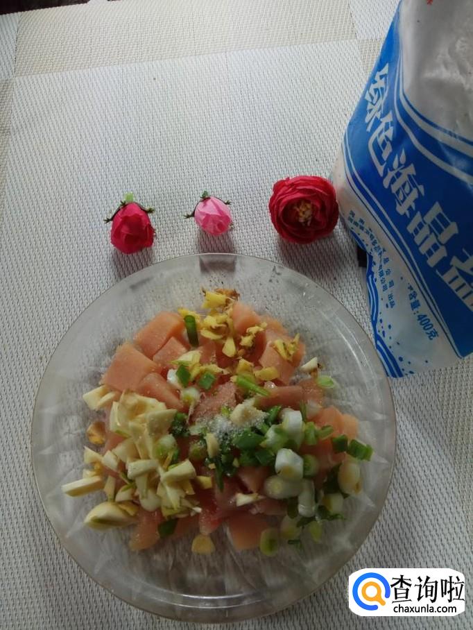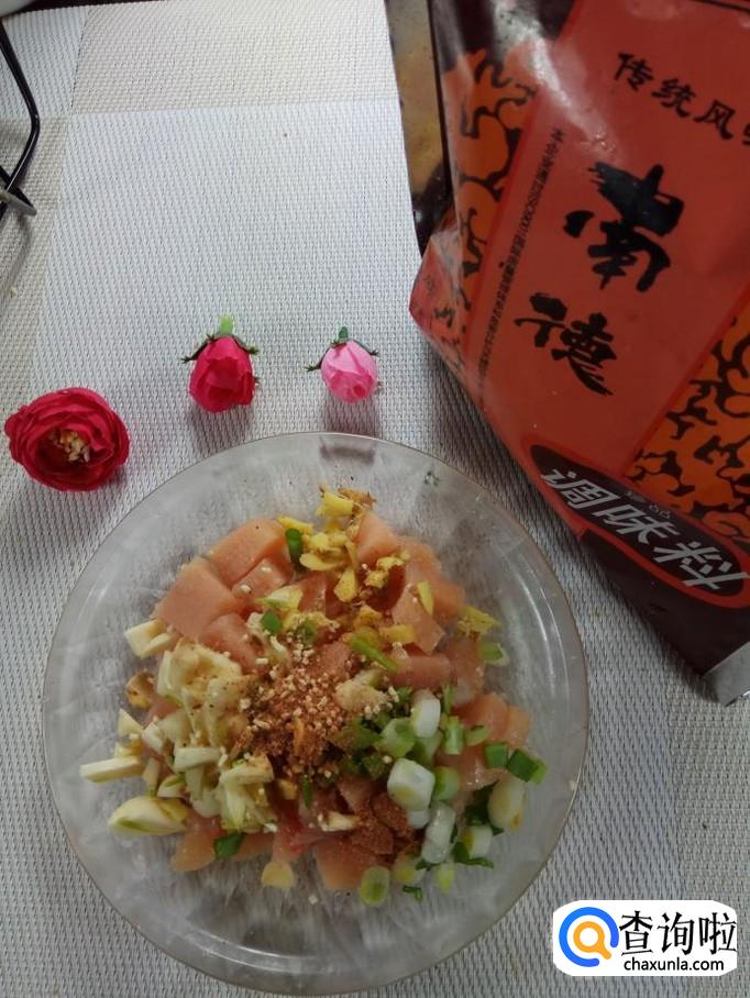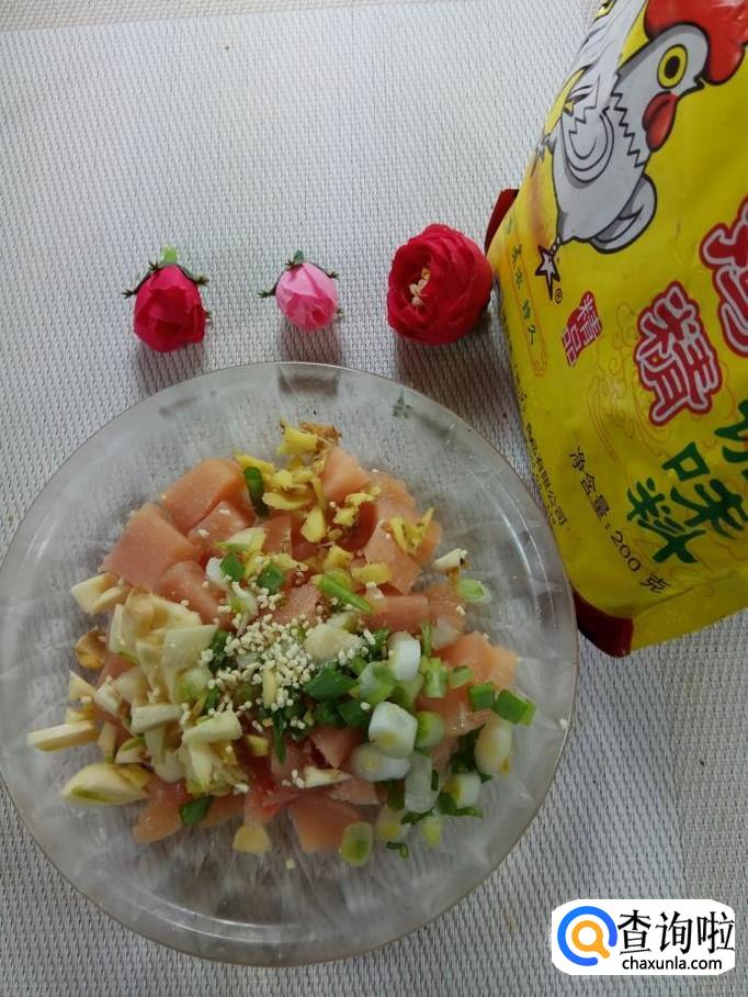 准备适量葱,姜,蒜,洗净后切碎,放在鸡胸肉上面,加入适量盐,鸡精,五香粉。