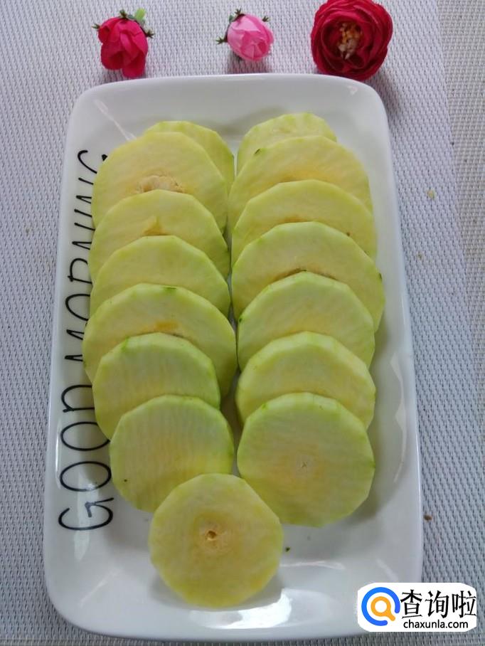 准备一个南瓜,洗净去皮后,切成片儿,均匀的摆在盘子。