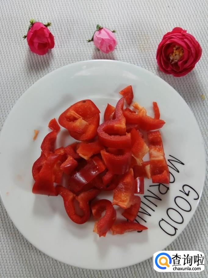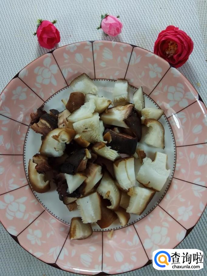 准备适量香菇,洗净后,切成丁儿,如果是干香菇的话,需要提前泡发;再准备适量红椒,洗净后切丁备用。