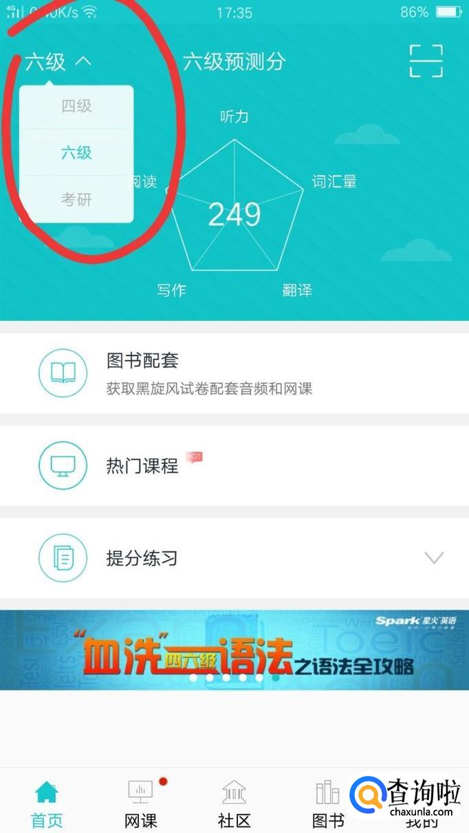 进入软件主页面,如图所示,点击左上角的菜单栏,选择“四级”、“六级”、“考研”。
