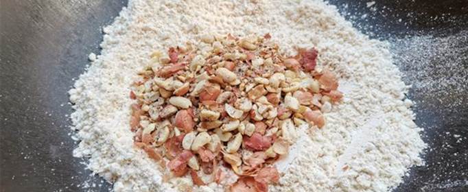 做法如下:把要做油茶的面粉放在铺好笼布的蒸锅里开大火蒸50min蒸熟,趁热把面中的面疙瘩捏碎,凉透备用。把花生米凉油下锅,开小火慢炒至花生表皮大量龟裂且花生米表皮明显颜色变深出锅,压成花生碎。锅里加适量的牛油,油7成热转小火下入蒸好的面,再一次倒入配料。一直翻炒至面变浅土黄色即可加盐翻炒出锅。