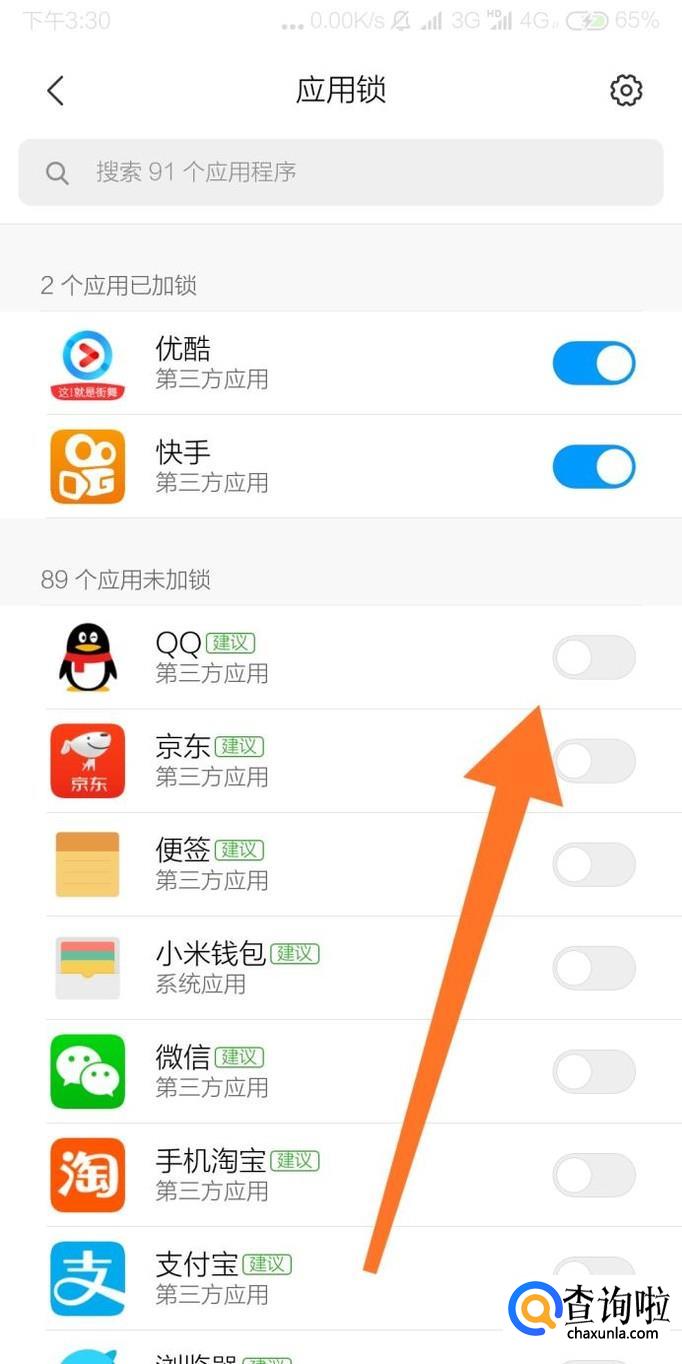 接下来就可以选择加锁的应用程序,开启应用程序名称右边的开关即可。