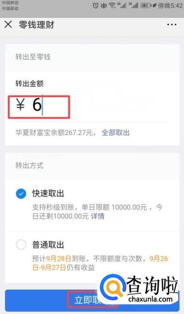 然后我们输入转出金额,之后我们点击立即取出就可以了。