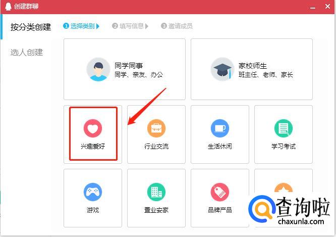 群聊类型,选择“兴趣爱好”。