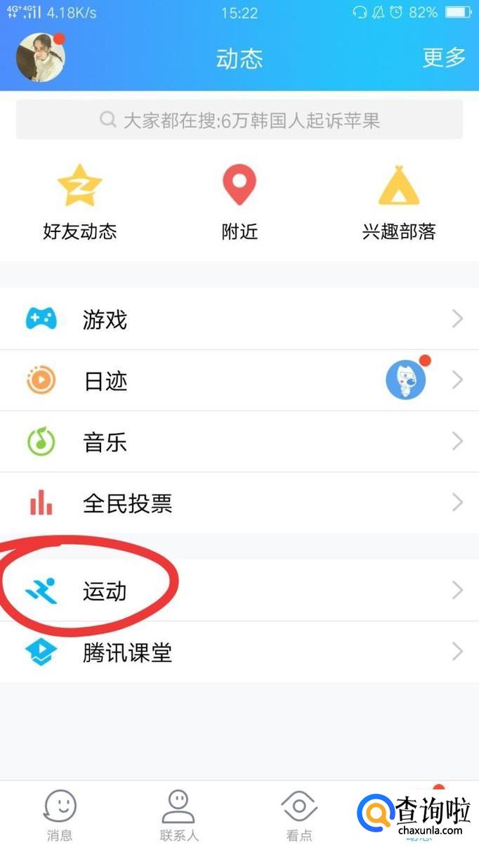 进入qq后,其界面如图1所示,我们点击界面右下角的"动态",在动态里面点击"运动",如图2所示