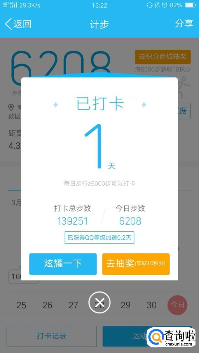 如图所示,qq运动就打卡成功了。一般都是选择在晚上打卡,因为这时候才能记录你走的总步数。