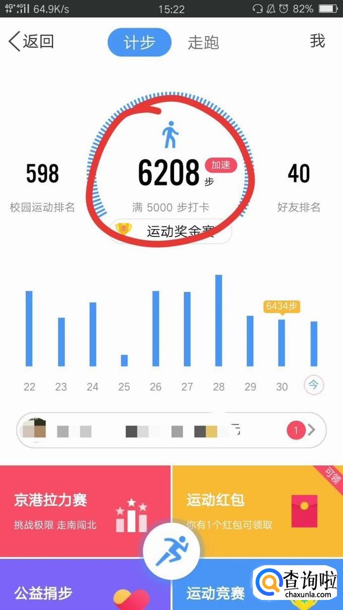 进入运动后,我们就可以看到今天走的步数,然后点击红色圈圈里面的位置。