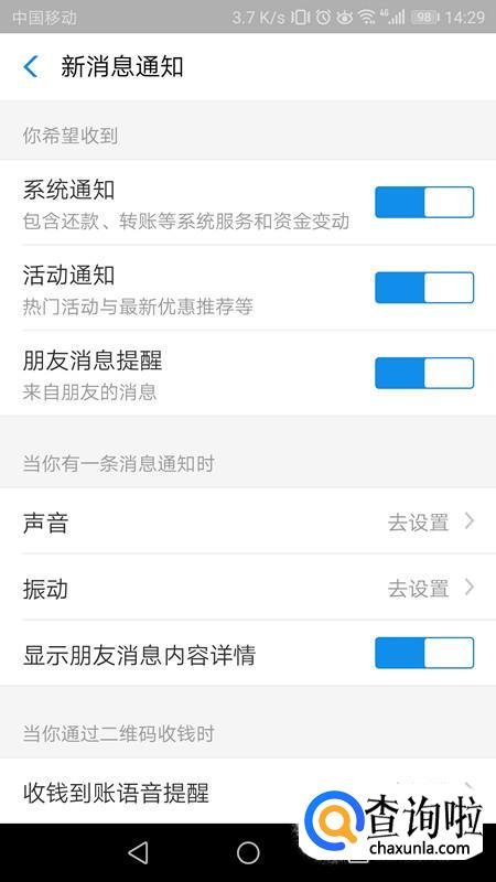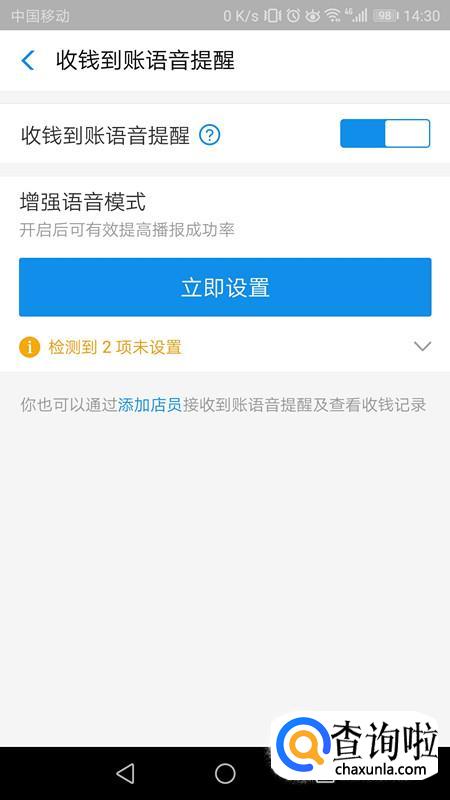 再选择点击收款通知,添店员就可以设置收款通知,设置好以后每收到一笔款都会收到语音通知。