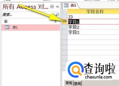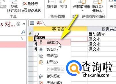 即时弹出设计界面。比如,要设置字段1为主键;选择“字段1”