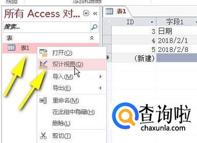 如图所示,鼠标右击“表1”,弹出菜单再点:设计视图