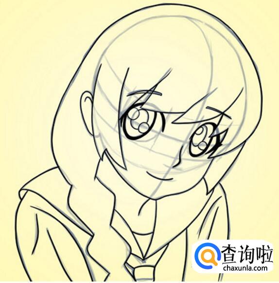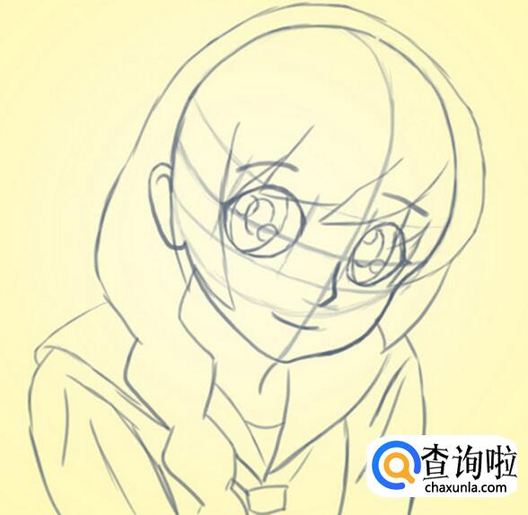 接着把任务的眼睛、鼻子、嘴巴勾勒出来,眼睛画大一点会显得更有神,也可以根据自己的喜好画出人物的发型。