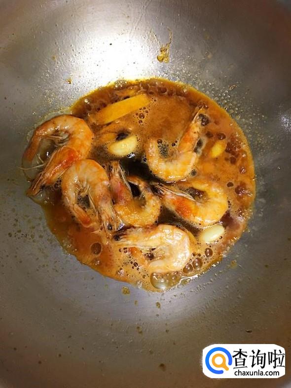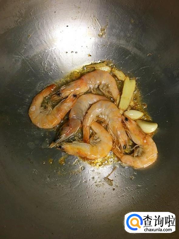 处理好的大海虾放入锅中,大火翻炒,炒至变色后再稍微多炒一会,这样虾肉略微收缩,吃的时候就更易剥壳,但炒制的时间也不宜过长,不然虾肉的口感就不嫩了。