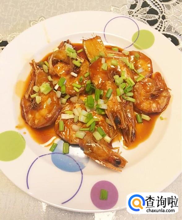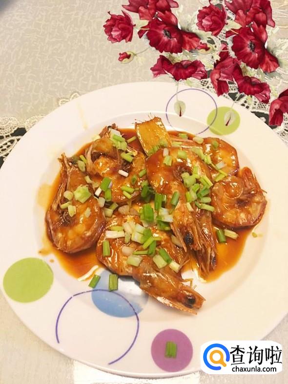 大火烧煮至酱汁浓稠时,轻轻地翻动大虾,让酱汁均匀地包裹在虾壳上,然后撒上葱花就可以出锅装盘了。