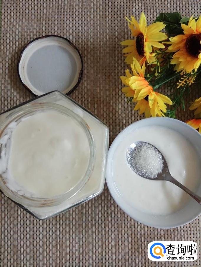 发酵好之后取出,取适量放入碗中,加入适量白砂糖,搅拌均匀。注意,也可以将发酵好的酸奶,放入冰箱中冷藏一夜,味道更佳。
