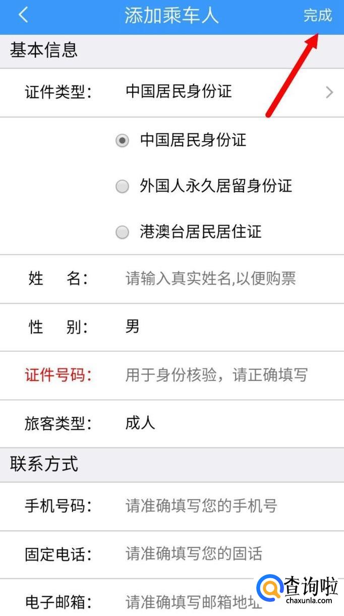 在这填写联系人的姓名、电话、身份证号码,点击右上角的完成就行啦!