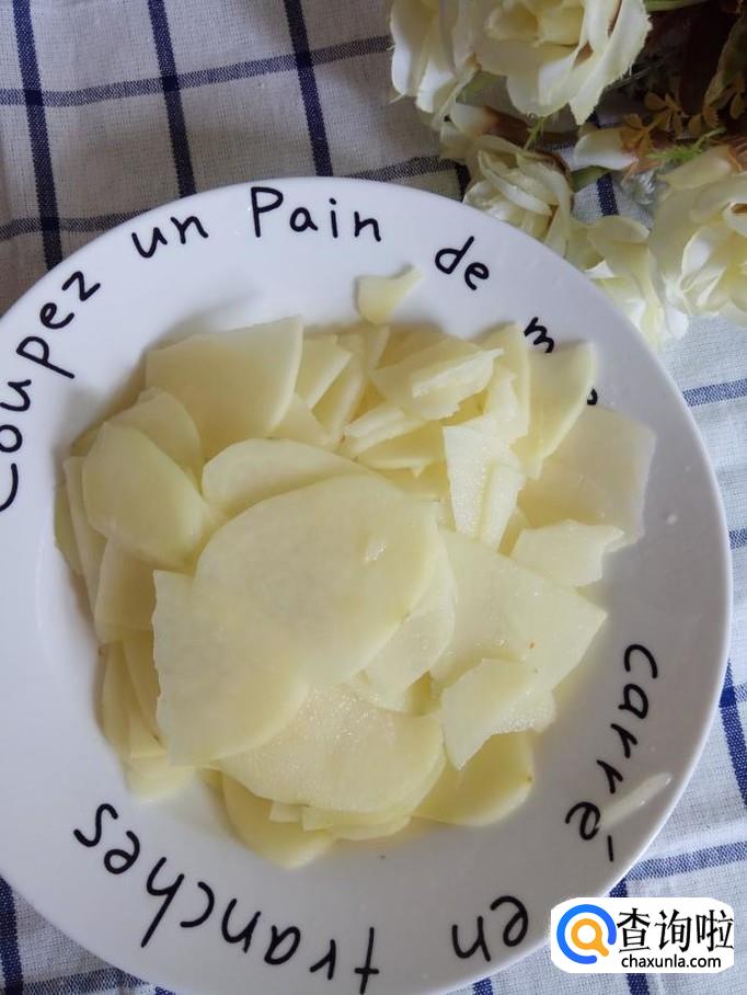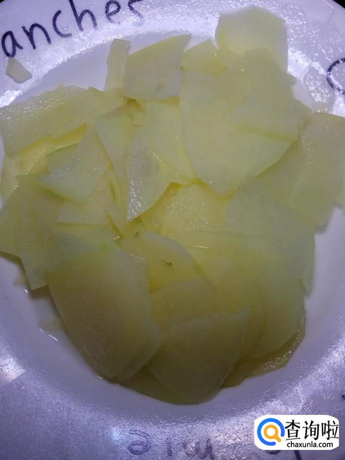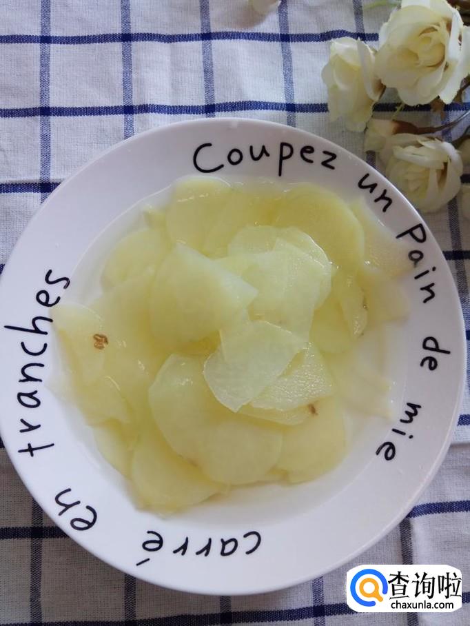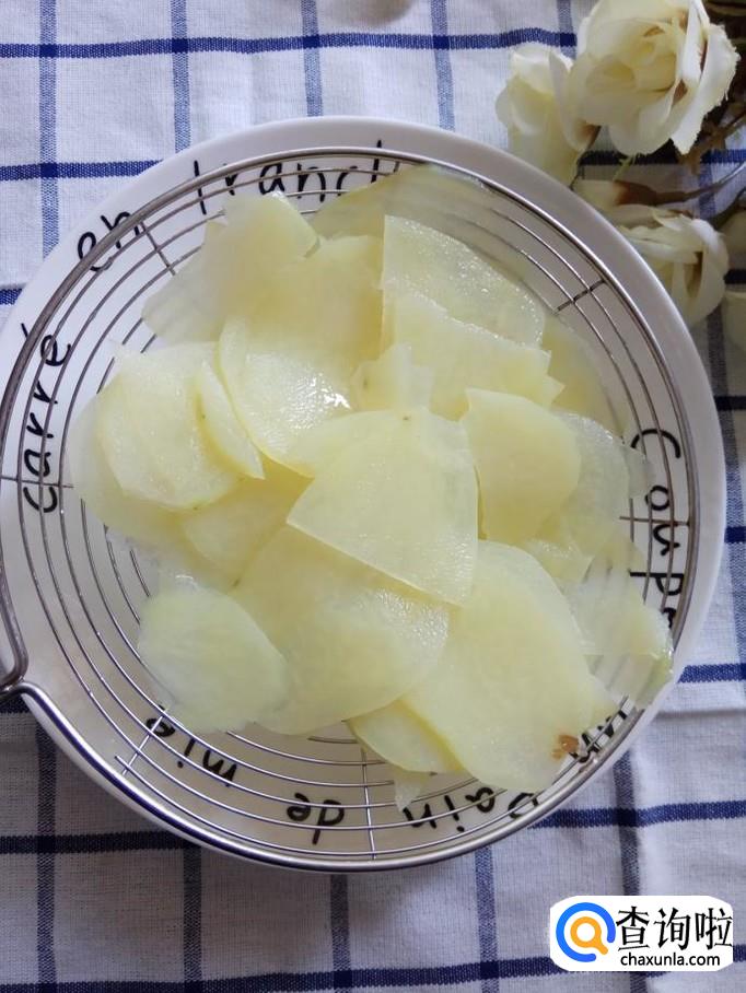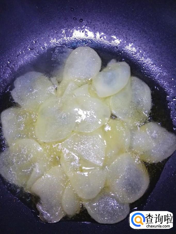 用擦板擦成薄片。用刀切的效果没有擦板擦的效果好,薄一点儿会更加酥脆好吃。