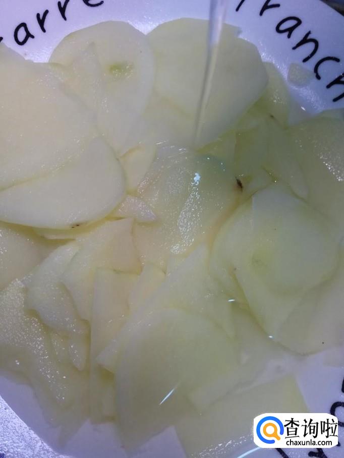 焯水后,捞出过凉水,控干水分。可以将土豆片放在笊篱上面,让水分沥干。