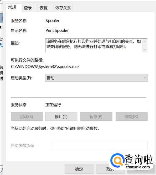 点击进入可以看到“print spooler”的启动状态。如果没有启动,在此页面中点击“启动”,并点击确定按钮。