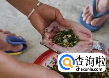 双手戴上塑料手套后,将制作好的佐料小心的放在鱼的肚子里面,然后将鱼肚子合拢在一起,之后用香茅草来捆住,以帮助进行固定,避免佐料流出来。
