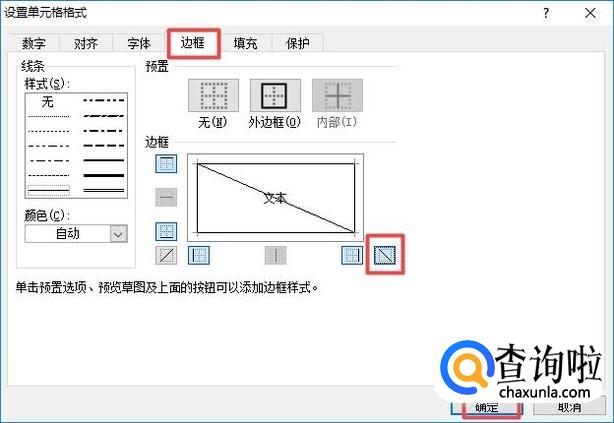 弹出的界面,我们点击边框,然后我们点击斜杆按钮,最后我们点击确定;