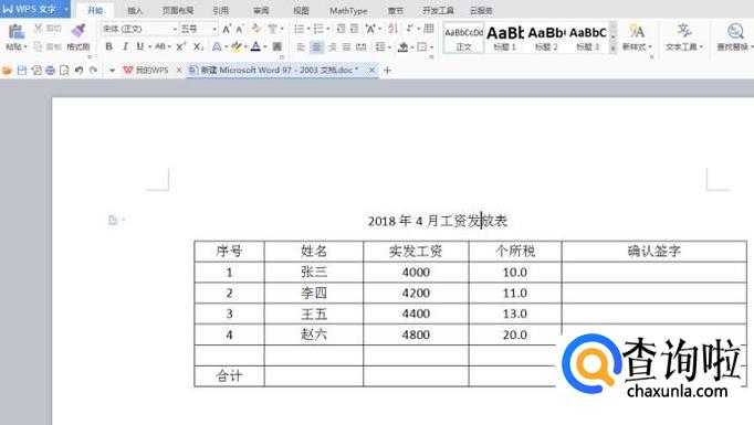 任意创建一个wps word文档,插入一个简单的表格作为例子,如图所示。