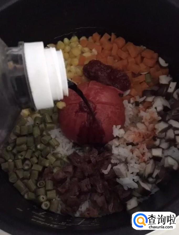 大米,清水,食用油,西红柿,香菇,胡萝卜,玉米,豆角,肥牛肉,盐,酱油,辣酱,香油
