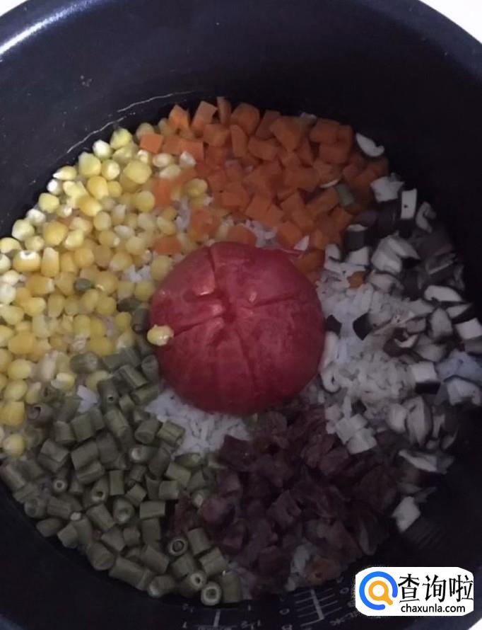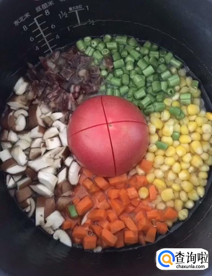然后我们再放入一个西红柿,放入切好的香菇丁,胡萝卜丁,玉米粒,豆角丁,肥牛肉丁,全部放好备用