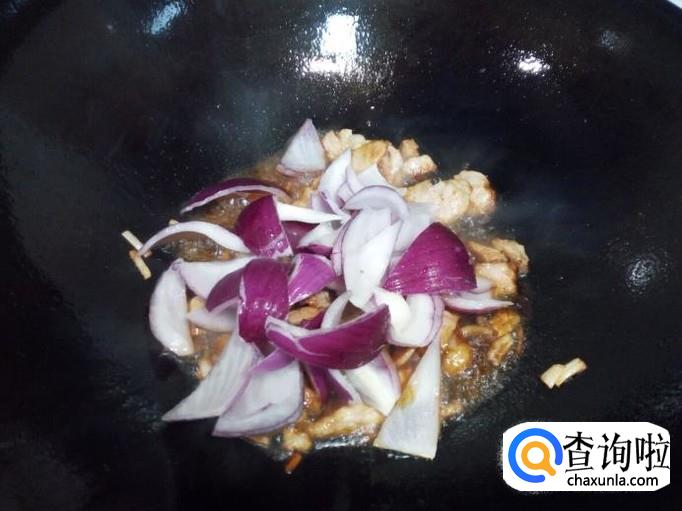 炒至肉片颜色微白,放入料酒,少许酱油,葱,姜,蒜,翻炒。随即放入圆葱快速翻炒,滴少许醋。