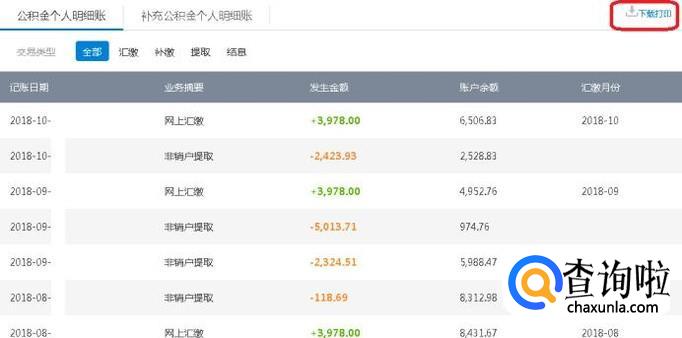 此时,就能看到公积金入账和使用情况了,如果想要把公积金流水打印出来,就点击右上角的“下载打印”按钮。