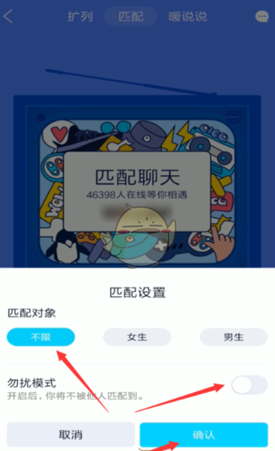 因为开启了勿扰模式的原因,可以进入匹配聊天界面,点击“设置”按钮,点击“不限”,关闭勿扰模式,点击“确定”即可。其次QQ扩列每日匹配次数是有一定上限的,只要达到了一定的次数,就可能会被系统提示匹配频繁,然后出现匹配失败的情况了。这个问题可以等到第二天重新再尝试扩列匹配,或者重新建一个账号,再去qq扩列进行匹配了。