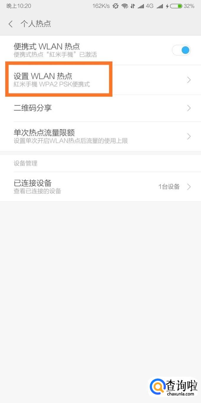 为了防止我们的手机热点被别人随意连接,可以进入“设置WLAN热点”选项,设置我们的热点密码。