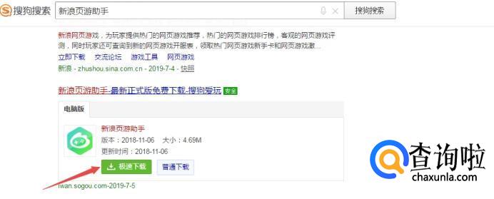 找到“新浪页游助手”,选择后面带有安全的字样的网站下载。点击“极速下载”。