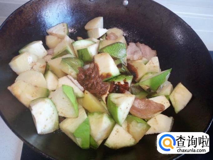土豆略翻炒一下,放入茄子翻炒。放入一匙儿豆酱(喜欢酱香味,可以多放些豆酱),放入酱油,料酒,盐。