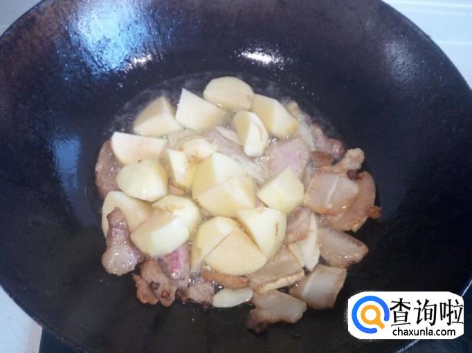 肉多炒一会,让肉下些猪油。然后放入葱,姜,蒜翻炒,随即放入土豆。