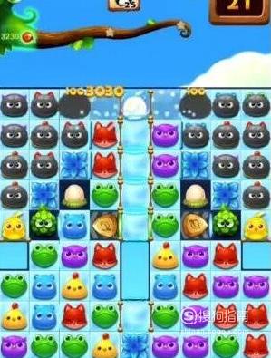 之后马上消除最下行中间的雪块。让动物填充最中间列。也同时会掉下新的闪电鸟。