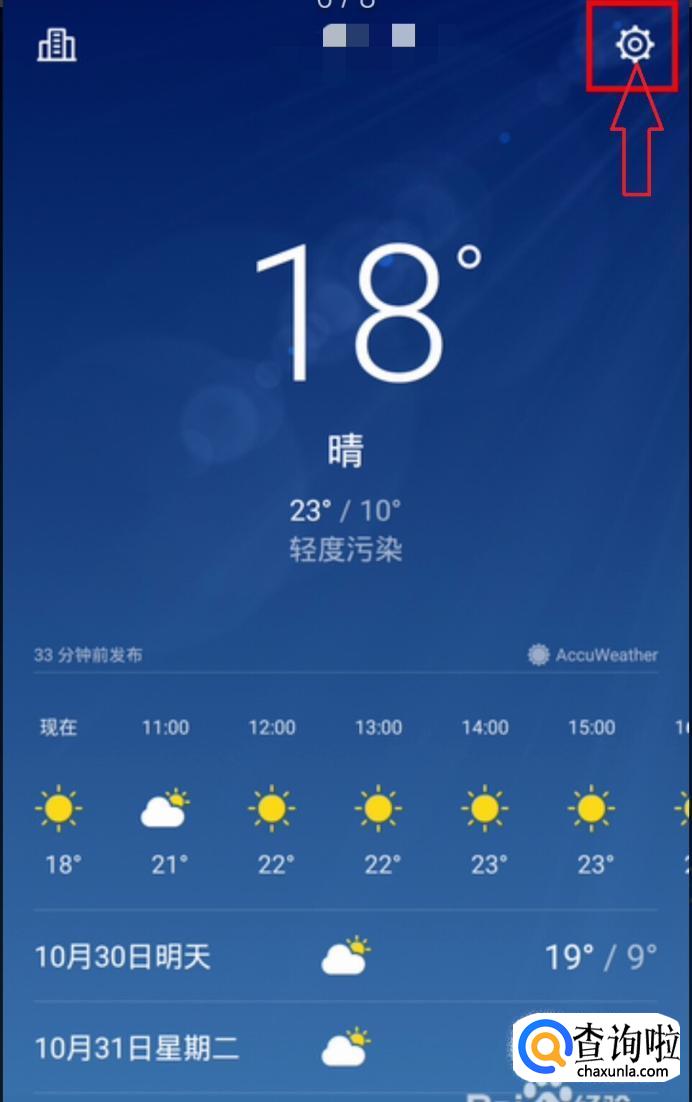 首先我们先解决一下手机自带的天气预报系统,自带的问题,我们先找到天气这个软件,打开它,进入到天气系统的界面,找到设置,点击它。