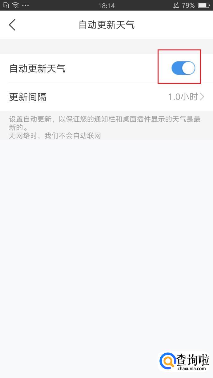 在设置中找到自动更新设置,点击它,查看是否为自动更新天气,如果没有,点击开启即可,如图所示。