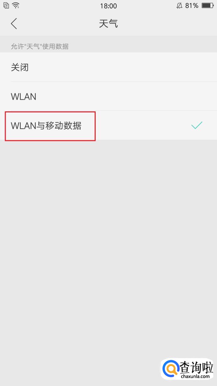 如果开启了自动更新,那可能是设置了该软件不能使用流量,我们打开设置,依次点开【双卡与移动网络】-【使用WLAN与移动网络的应有】-【天气】,进入过后,设置为【WLAN与移动数据】状态下使用该软件,如图所示。