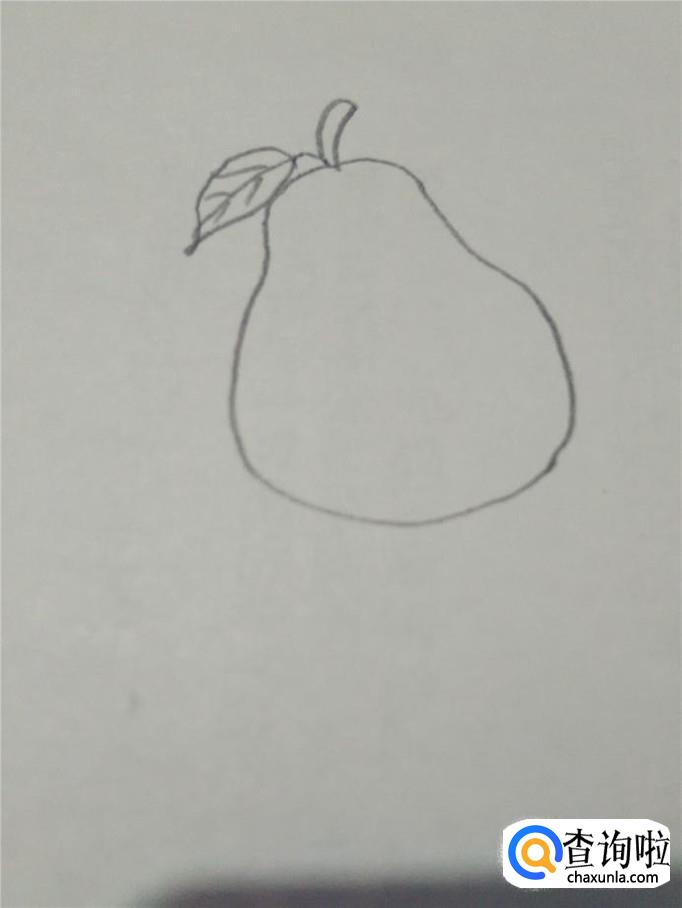 在梨把儿的根部往左画一片叶子,叶子中间画出分叉,表示叶脉。