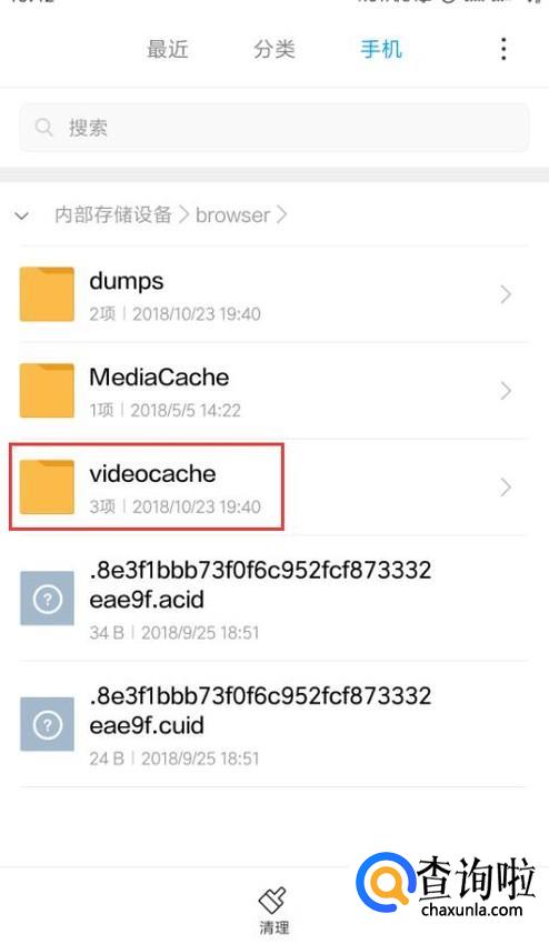 打开手机中的文件管理器,切换到“手机”分类,在其中找到文件夹“browser”,这是浏览器的存储文件夹。