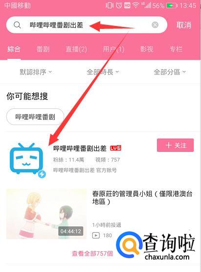 在搜索位置进行输入搜索“哔哩哔哩番剧出差”。