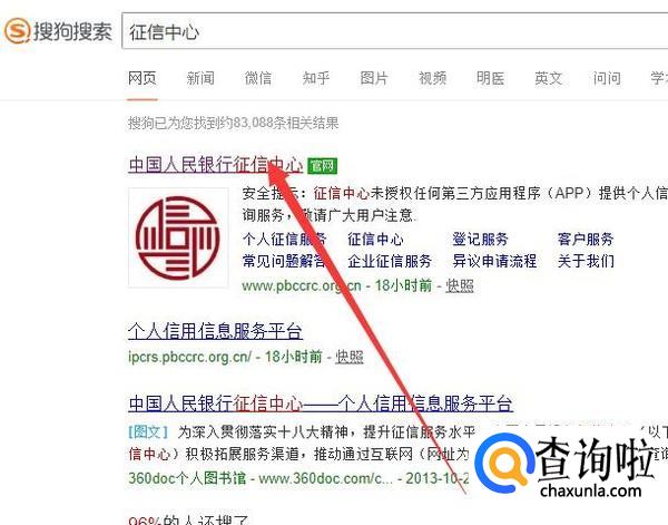 在搜索位置搜索“征信中心”官网,点击并进入,如图所示。