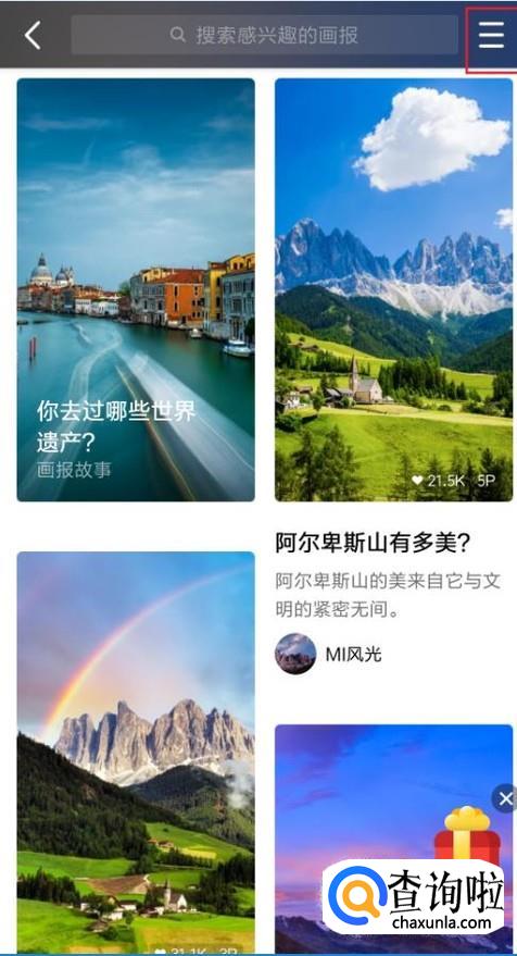 在接下来打开的锁屏画报页面中,点击页面右上角“三”按钮。