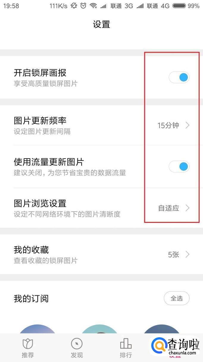 接下来,将打开锁屏画报设置页面,在该设置页面中,可以设置锁屏画报的更新频率和图片清晰度等,依据个人喜好设置。