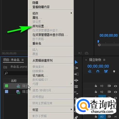 鼠标移到项目面板这里,右击序列,弹出右键菜单,再点:序列设置