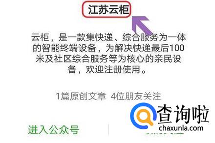 快递柜的种类有很多,不过大部分都有对应的微信公众号,我们首先就是要搜索找到它,比如下图就是小编一直在用的“江苏云柜”;