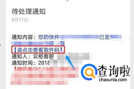 如果我们有快递放进了云柜里,那么这里就会有提醒,并且其中有一项“请点击查看取件码”,这样随时都可以找回那个取件码了,如图;
