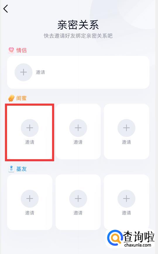 进入亲密关系详情页后,可以看到有多种亲密身份(情侣、闺蜜、基友),大家可以根据自己的需求来选择添加对应的亲密关系。所有亲密关系的建立方法都是一样的,此处以“闺蜜”为例。