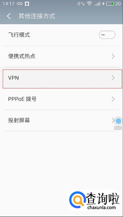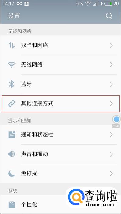 在设置中找到无线和网络,在无线和网络中找到其他连接方式。