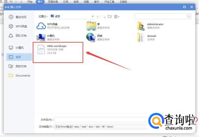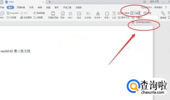 点击【对象】会弹出选项,点击【文件中的文字】,再选中第一张wps文档,如下图所示: